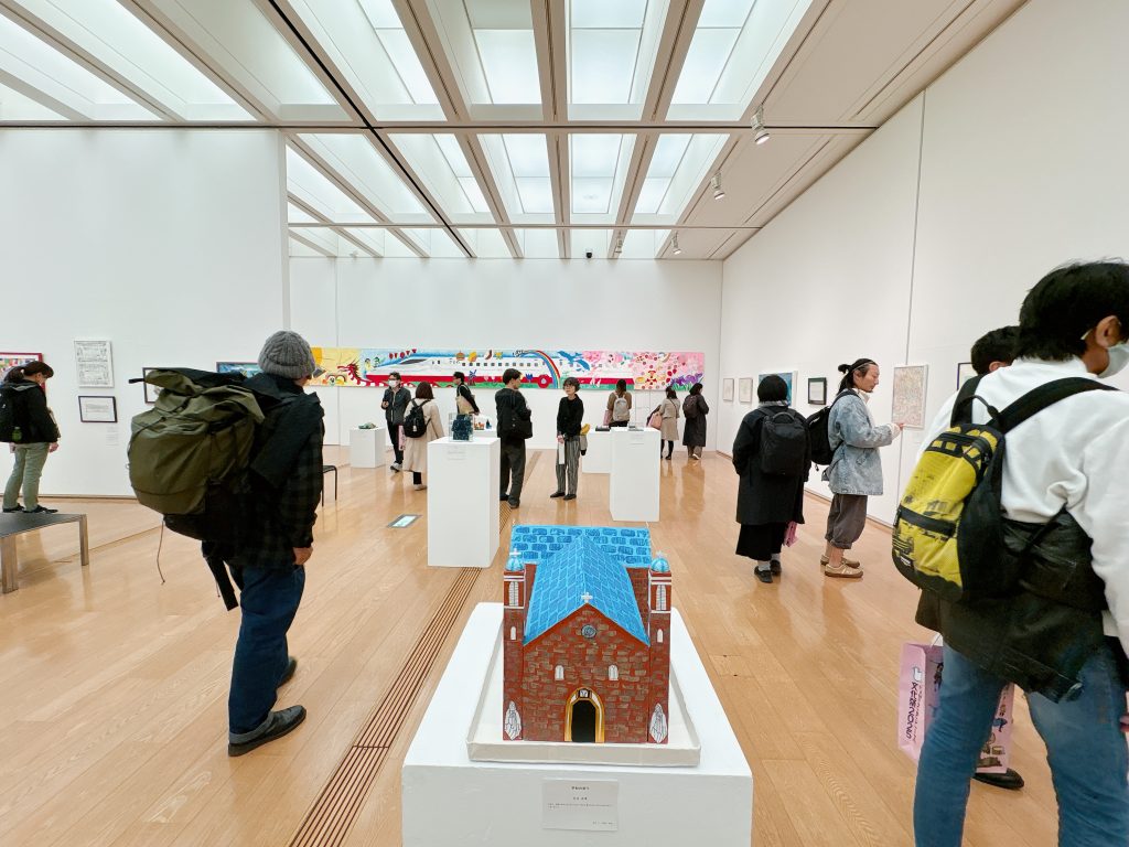 交流会後は、長崎県立美術館での「ながさきピースアート展」の鑑賞を行いました。長崎県在住の障害のある人が制作した絵画、書、手工芸作品を中心に、県展の入選作品等も合わせ約400点のアート作品が展示されています。